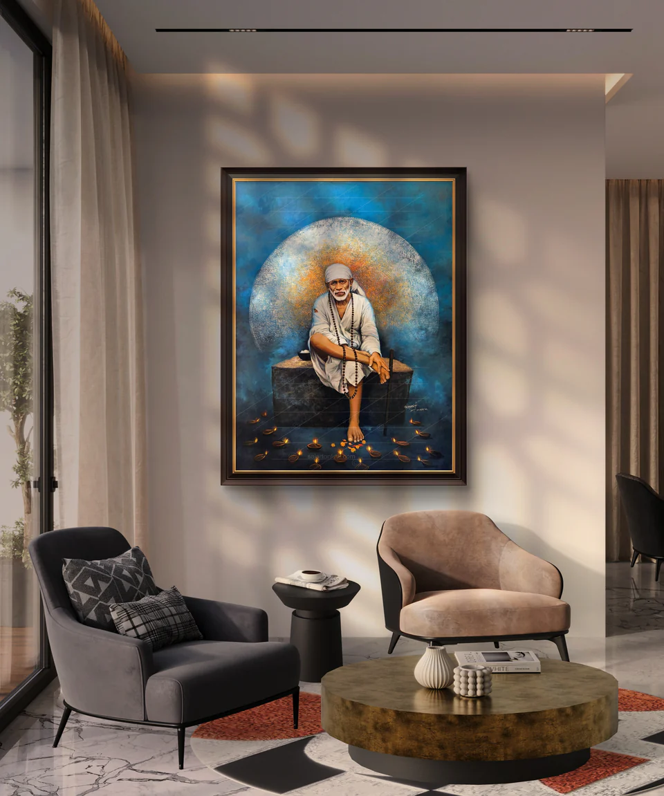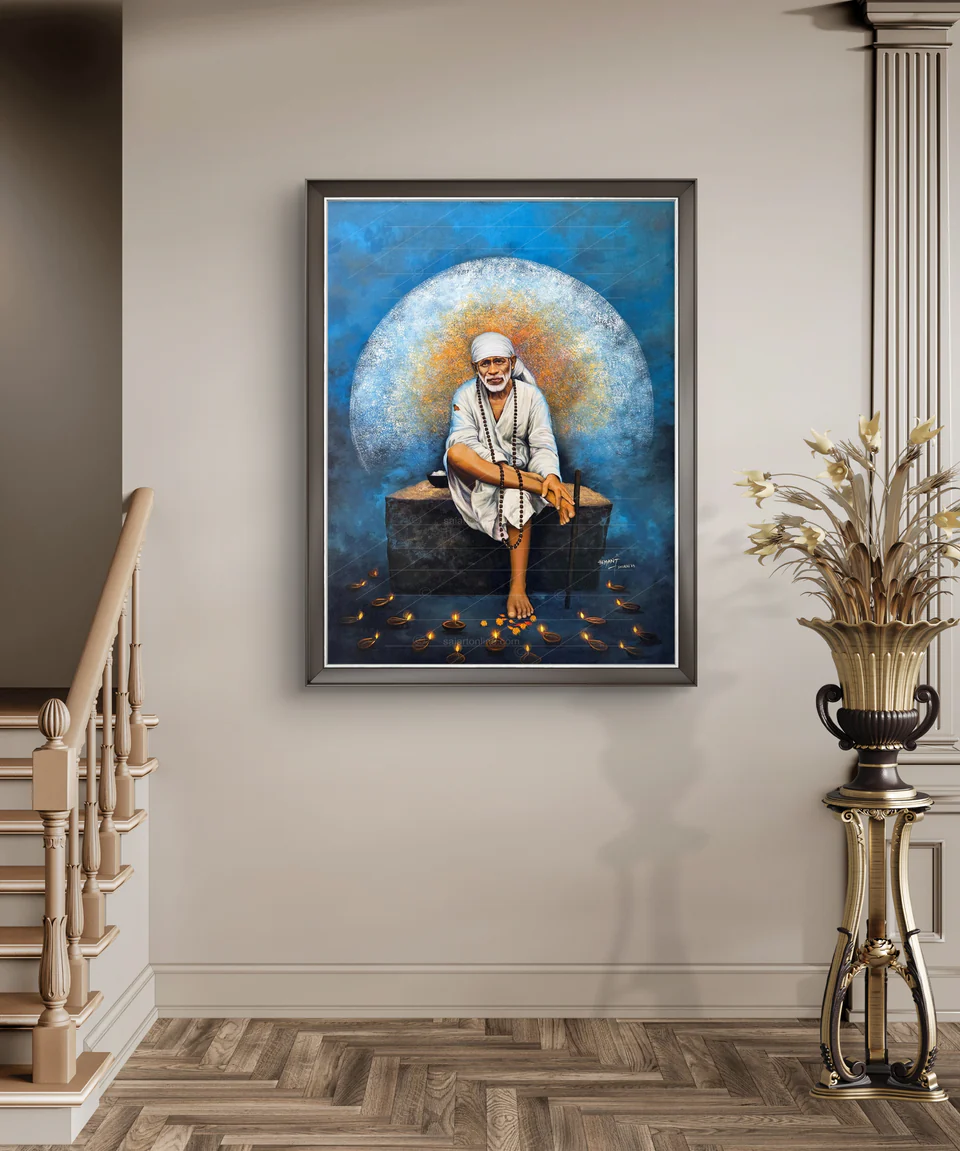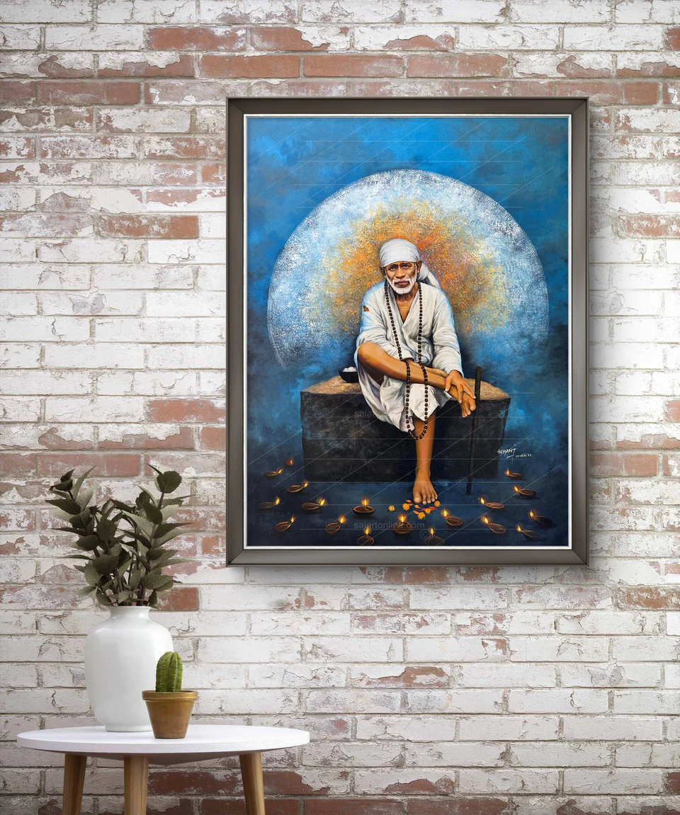 If you are searching for Sai Baba sitting on stone photos, Sai Baba sitting stone wall art, or premium Sai Baba painting for home, this spiritual canvas artwork is a meaningful addition to your devotional space.